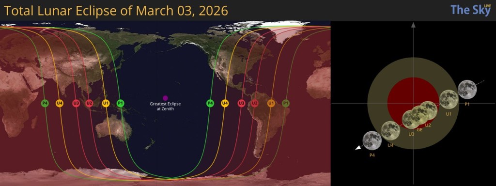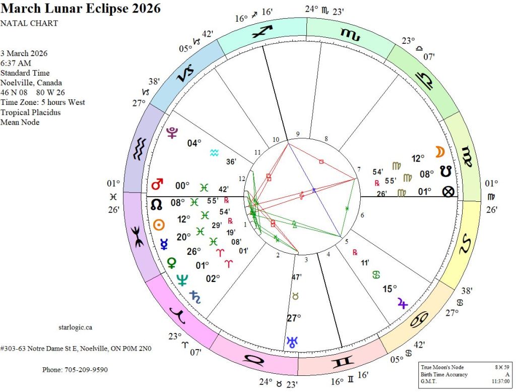 This time, Mars and Pluto are above the horizon, ahead of the Sun and the following planets in Pisces and Aries. The Iran War won’t end anytime soon, in my humble opinion. But the Moon turning blood red sounds apocryphal, doesn’t it? Evidently, the eclipse can be seen by up to three billion people.