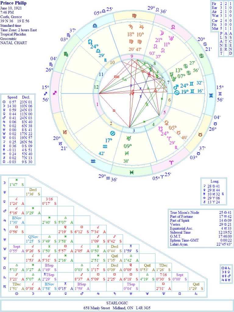 Philip’s birth time has always been problematic. Most charts show 9:46 pm, which would make him a Capricorn Rising individual. That would be ridiculous. Even the screenwriter for The Crown spoke of his restlessness. He could never keep still, always wanting to be out and about, on the town, or with his friends. That’s more like Sagittarius Rising. So, I rectified his chart by recognizing that 9:46 may have been written as 19:46, which would actually be 7:46 pm instead.