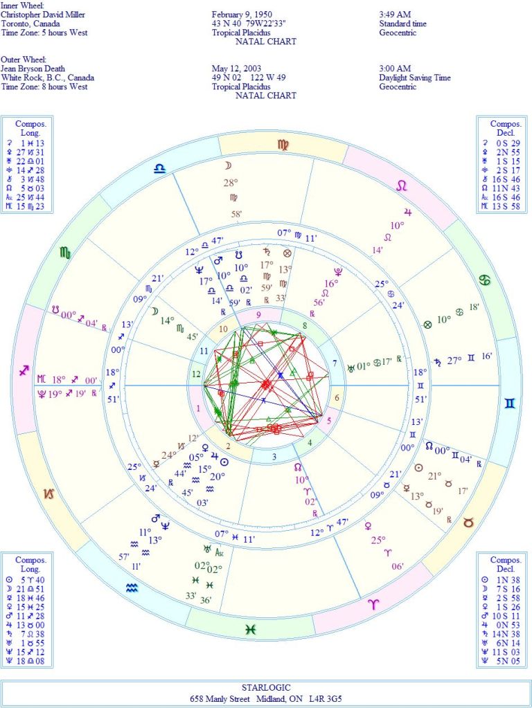 There are so many significant aspects between these two charts, I could overwhelm you, the reader. First of all, notice how the inconjuncts again point from my natal Mars/Midhaven conjunction but this time toward the ‘event’ Mercury. And the other inconjunct links the ‘event’ Sun with my Ascendant, which is conjunct the event’s Midheaven/Pluto conjunction. (I have forgotten my mother’s exact time of passing, so the Ascendant and Midheaven positions may not be exact, but close enough for jazz.)