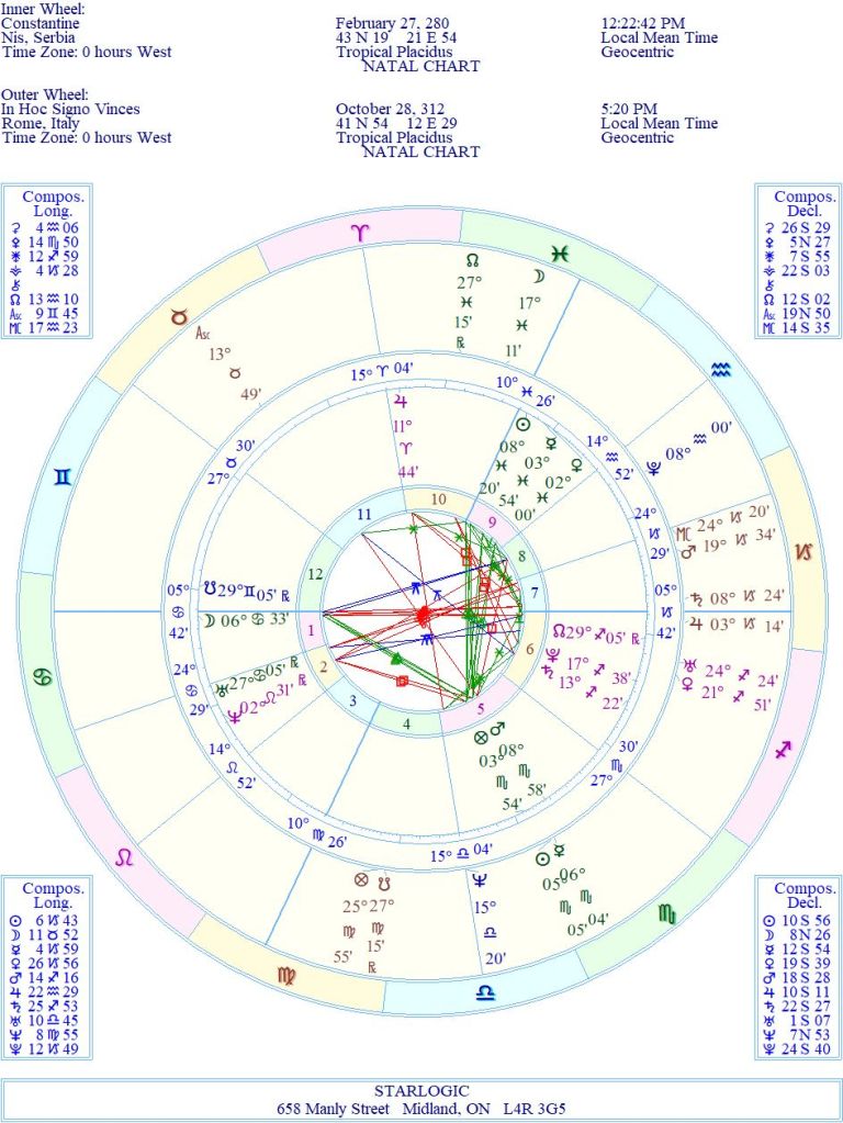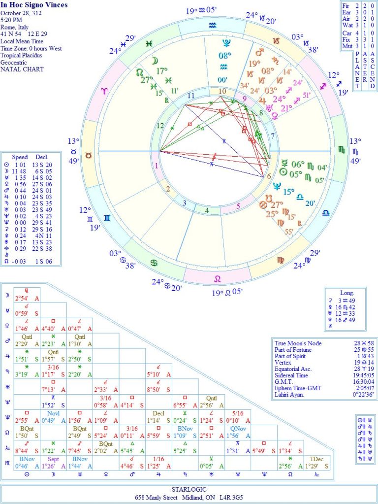 The Moon conjunct his Ascendant in Cancer would make him especially empathetic towards the ‘underdog’. In fact, he may have seen himself in that role. And there are a couple of inconjuncts, but I’m going to skip any discussion about them, as too much is unknown. But for those with eyes that see, the makings of the man who would legitimize the new Christian religion are evident.