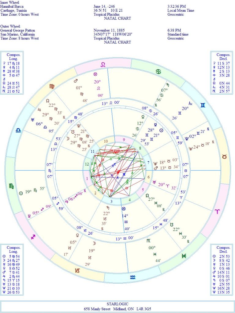 As we learned years ago, the 9th House cusp of the older chart needs a trigger planet from the newer chart to show the connection between them. Patton’s Saturn is the ‘proof’. And Patton’s Ascendant is conjunct Hannibal’s Sun. This is powerful, indeed.