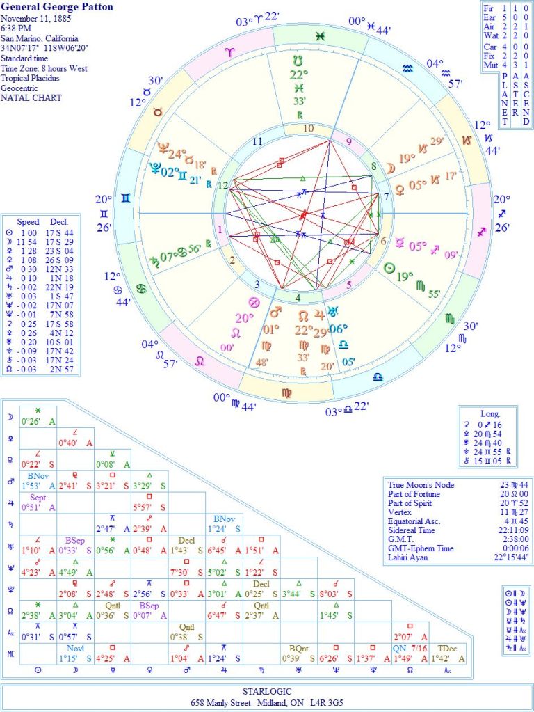 It’s that Yod pointing at Patton’s Ascendant that makes me sit up and take notice, but the fact that the Sun and the Moon are doing the pointing means that the effect is doubled if not tripled. He has a Gemini spirit, for sure. The Moon is in Capricorn (hard-hearted) and the Sun is in Scorpio (deep retribution). He couldn’t be anything but ‘blood and guts’, could he?