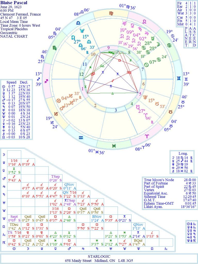 It’s not difficult to see why Pascal was such a visionary: the Yod pointing to Pluto supported by Neptune and the Ascendant. And yet is the triplicity of planetary couplets that shows his genius: the Moon conjunct Mercury @ 28 Cancer; Jupiter and Saturn conjunct around 3 Leo; and finally Venus conjunct Uranus around 10 Leo (inconjunct Mars @ 13 Capricorn). Chiron is @ 18 Pisces in the 3rd House of knowledge. A veritable spider’s web of energy.