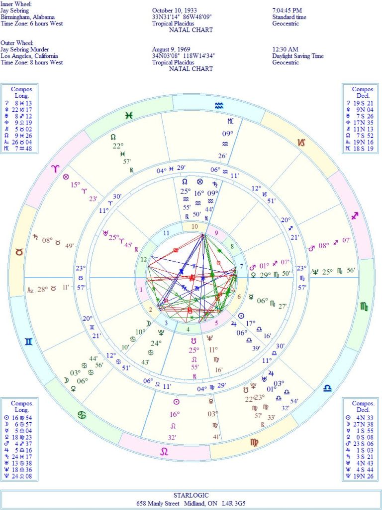 Sebring’s birth time is randomized, and yet when compared with his ‘murder’ chart, the Ascendants are in the same sign of Taurus. I wasn’t expecting that. That doesn’t make the birth time correct, however, so the actual House placements might be different. However, he married in 1960, so this could be represented by Venus in his birth chart.