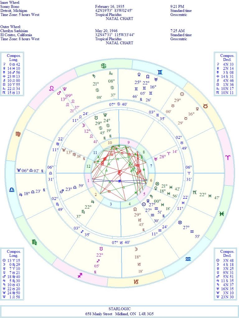 There are good connections between them, but also some uncomfortable ones, too. The strong link is between Sonny’s Ascendant and Cher’s Neptune. She would have felt a bit like a mystery to him. His Moon is conjunct her Pluto/Mars aspect. His Pluto is conjunct her Saturn, which means that he would have shaken her to the core of her being. And her Part of Fortune is conjunct his Sun/Mercury aspect. That’s evident by what happened to them after “I Got You, Babe” exploded onto the scene in the middle 1960’s.