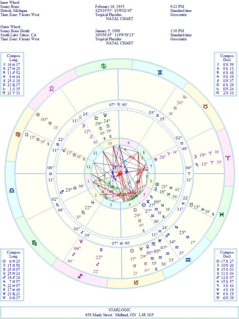 I’m trusting that Sonny’s birth time is accurate, as it was already on my Kepler 7.0 computer program. Just the usual stresses here: no inconjuncts. Therefore, no axes to grind. He’s a Libra Rising individual, which means that relationships came naturally to him. However, that Mars in Libra in the 1st House may indicate that he had a temper, and its opposition to Uranus in Aries may also indicate that he had a quick-fire one.