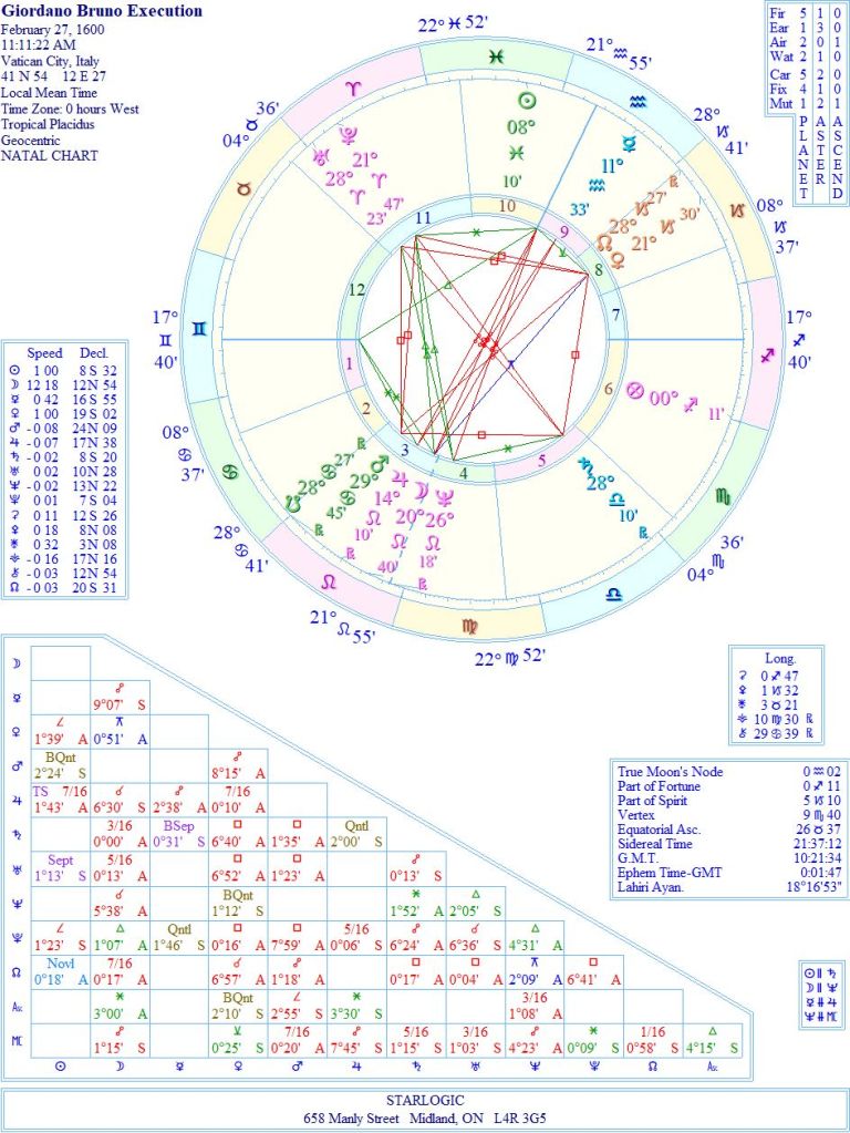The original Yod in Bruno’s birth chart is now accentuated by Pluto and the Midheaven in his ‘fatal’ chart. So, Uranus is the reason he was executed by the Roman Catholic Church. He was four centuries too far ahead of his time to be tolerated. He would have been better accepted today. Sometimes, it cannot be helped. Truth is truth, no matter when it was stated.