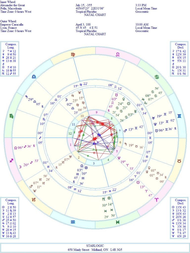 One of the ways to prove or disprove the theory is how their birth charts align. Alexander’s Mars is conjunct Caracalla’s Pluto. That’s a strong indicator, for sure. And the double Yod pointing at Caracalla’s Mercury/Venus conjunction is supported by the inconjuncts of the Moon and the Ascendant in Alexander’s chart. Plus, Caracalla’s Sun is inconjunct to Alexander’s Neptune/Midheaven conjunction. Alexander’s Mars is conjunct Caracalla’s Mars, while another Yod points at Caracalla’s Moon, with the inconjuncts of Alexander’s Saturn and Sun. I think it fair to say, Caracalla was right!