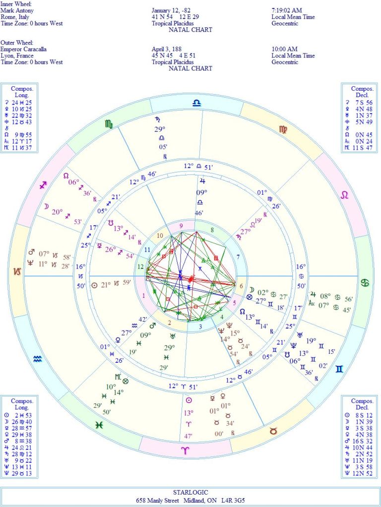 There are other inconjuncts: Antony’s Jupiter and Caracalla’s Midheaven; Antony’s Ascendant/Sun and Caracalla’s Uranus; and Antony’s Uranus and Caracalla’s Saturn.