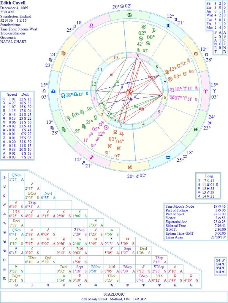 If Edith Cavell had been aware of her birth chart, she might have wondered what that Yod pointing at Pluto meant. It was, more-or-less, timed for her late 40’s.