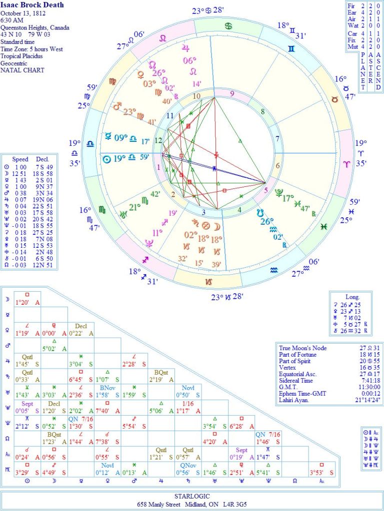 The combined charts shows a life well lived, in spite of the end. The Sun/Mercury/Ascendant of the ‘fatal’ chart perfectly links up with the Sun/Mars conjunction of his ‘natal’ chart. This man was born a soldier and died one. It was his life’s love (Venus conjunct Venus) and his Sagittarius personality was to become legendary (‘natal’ Ascendant conjunct ‘fatal’ Neptune).
