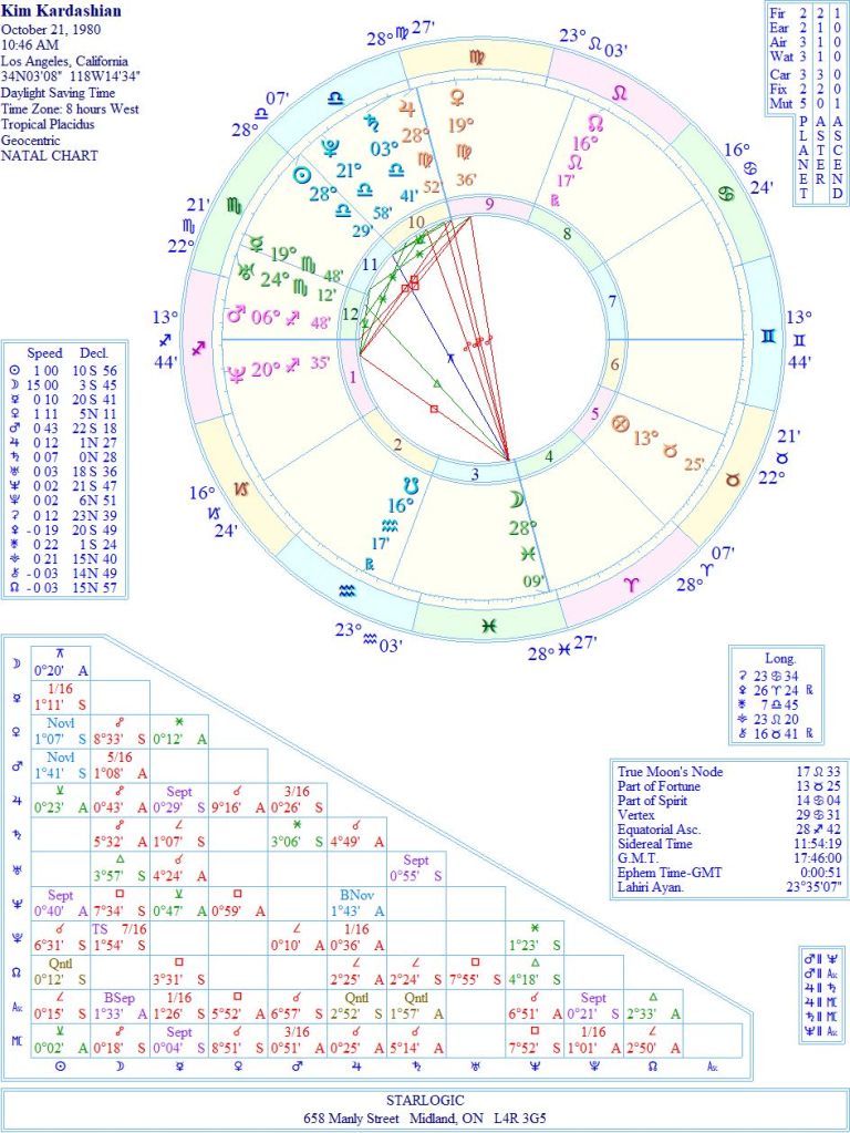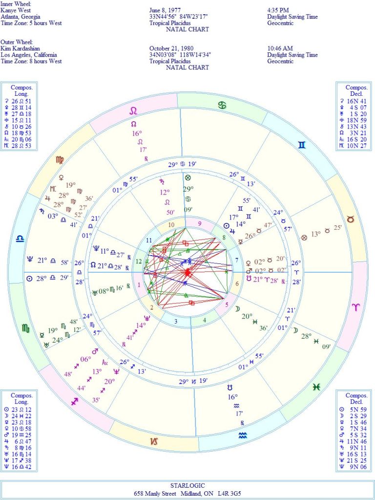 I’m combining Kim’s birth chart with Kanye’s to show how ‘correct’ his rectified birth chart really is: Kim’s Sun being conjunct to Kanye’s Ascendant speaks volumes. And the Yods affect both individuals equally. At the same time, Kanye’s Neptune is conjunct Kim’s Ascendant. They were made for each other. Plus, it helps that their Moons are within 8 degrees of each other in Pisces. They have popularity in spades, for sure.
