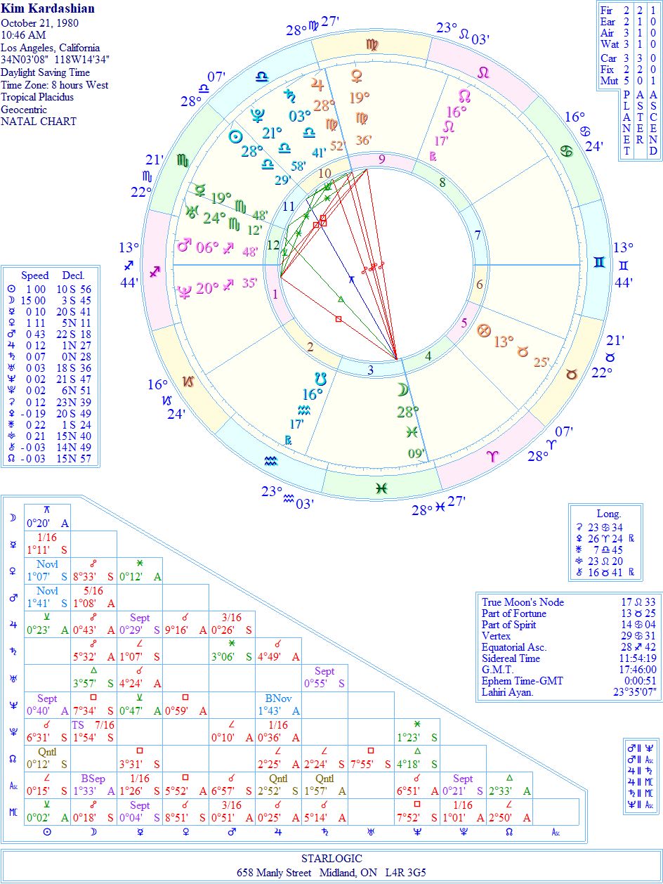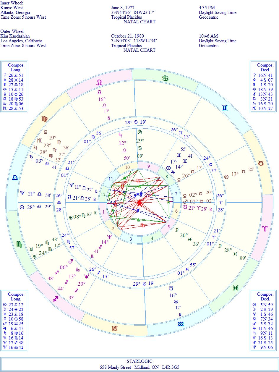 I’m combining Kim’s birth chart with Kanye’s to show how ‘correct’ his rectified birth chart really is: Kim’s Sun being conjunct to Kanye’s Ascendant speaks volumes. And the Yods affect both individuals equally. At the same time, Kanye’s Neptune is conjunct Kim’s Ascendant. They were made for each other. Plus, it helps that their Moons are within 8 degrees of each other in Pisces. They have popularity in spades, for sure.