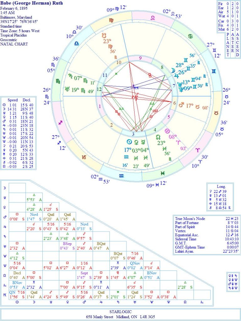 All the astrology sites have 1:45 pm as his birth time. Well, I’ve decided to flip that on its head by using 1:45 am, instead. A different picture emerges that seems more in keeping with the enigma of the Babe. However, the one thing that wouldn’t change is the inconjunct between Saturn and Pluto.