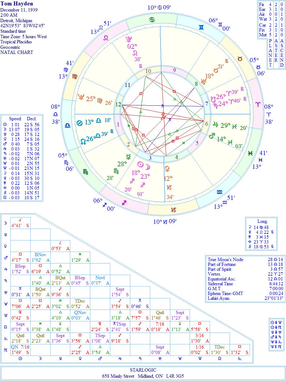Most astrology sites, and my Kepler 7.0 program, state that his supposed birth time was 2:00 pm. But that wasn’t dynamic enough to explain how Hayden became a spokesperson for the anti-war movement in the late 60’s, early 70’s. The alternative time was suggested as 2:00 am. I think that birth time fits him, and his life, better.