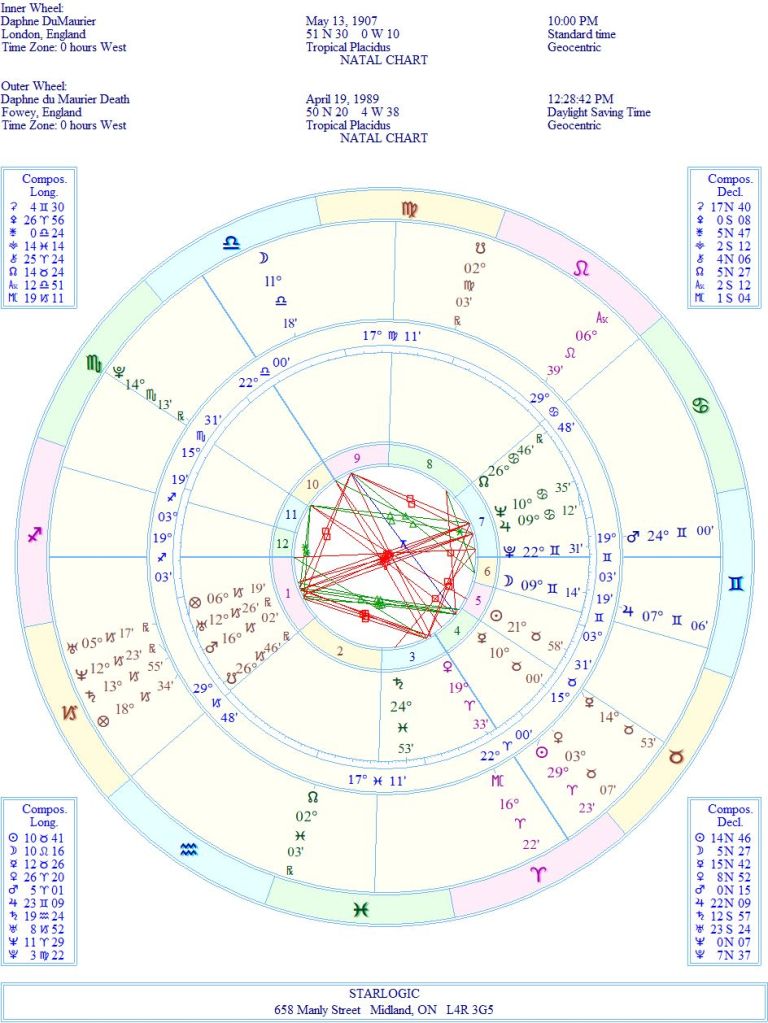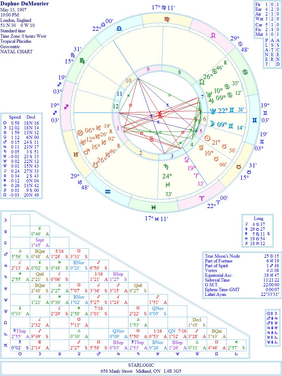 Because Daphne married her husband, Sir Frederick Browning, at about age 25, I see the Pluto placement of this rectified chart as an ‘eye-opener’ for her. And that Gemini Moon hasn’t gone unnoticed either. I suspect she always identified with both sides.
