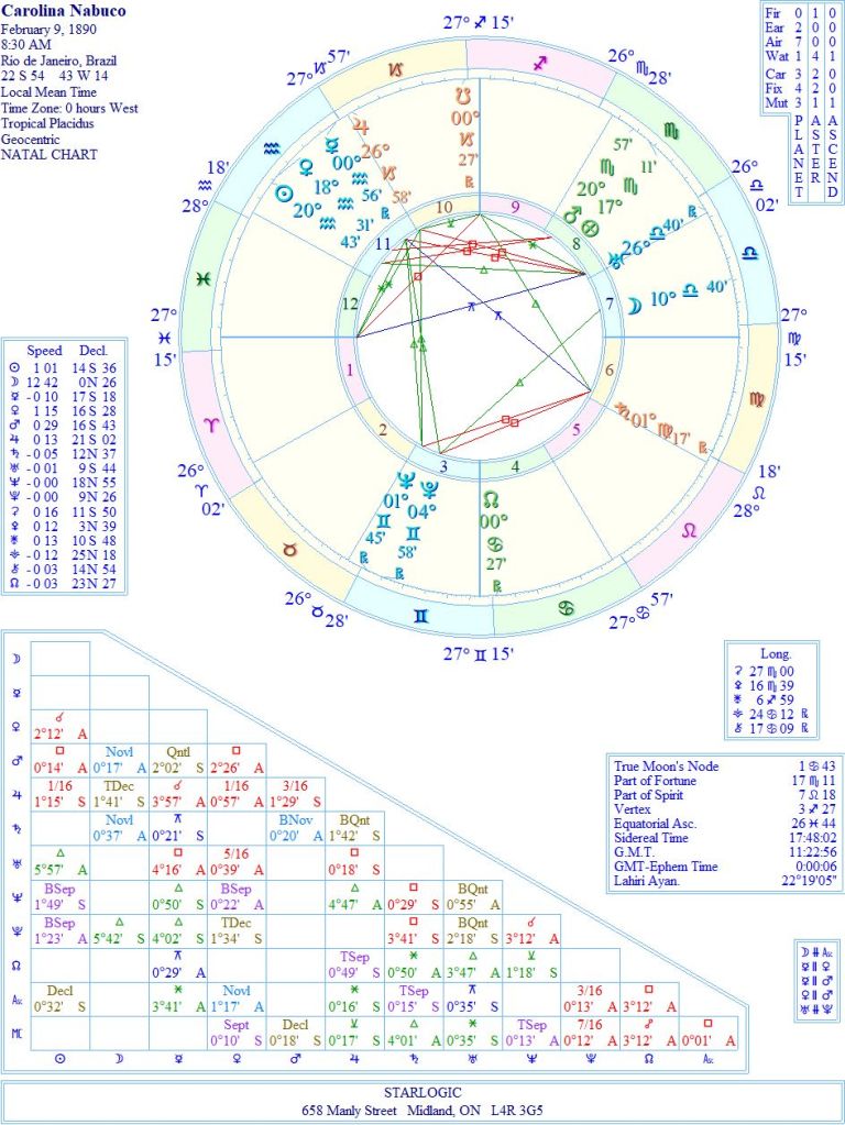 This is an ‘inspired’ birth time (which actually belongs to a different Nabuco: her father, Joaquim, the Brazilian Ambassador to the United States, born on August 19, 1849. Interesting coincidence: Carolina died August 18, 1981). The timing isn’t confirmed.
