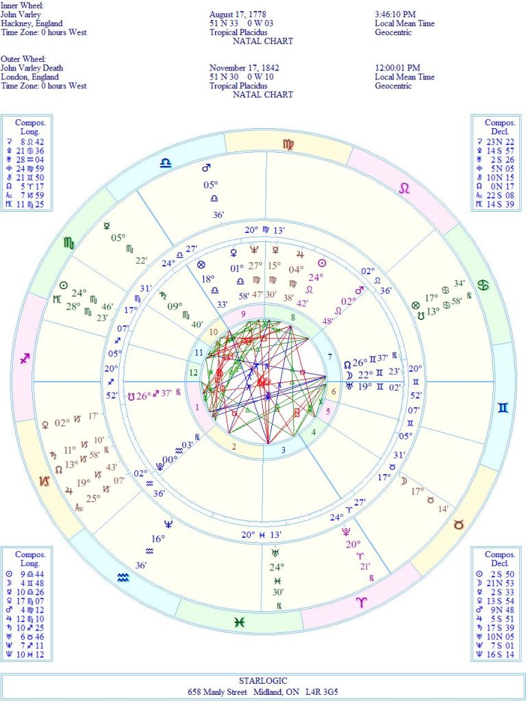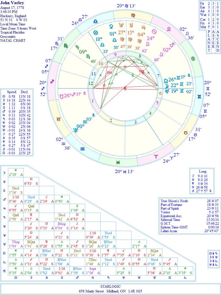 In my third post (from April 2014) I speculated on whether I might have been William Blake in a past life. Upon further reflection, I decided I was more likely to have been John Varley. Now, since I have ‘perfected’ the ability to wheedle out the connections between charts, I’m going to specifically look at this man.