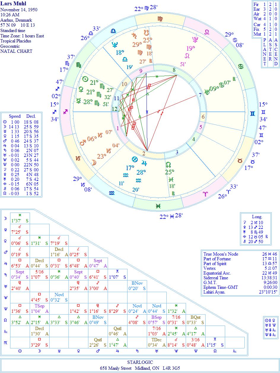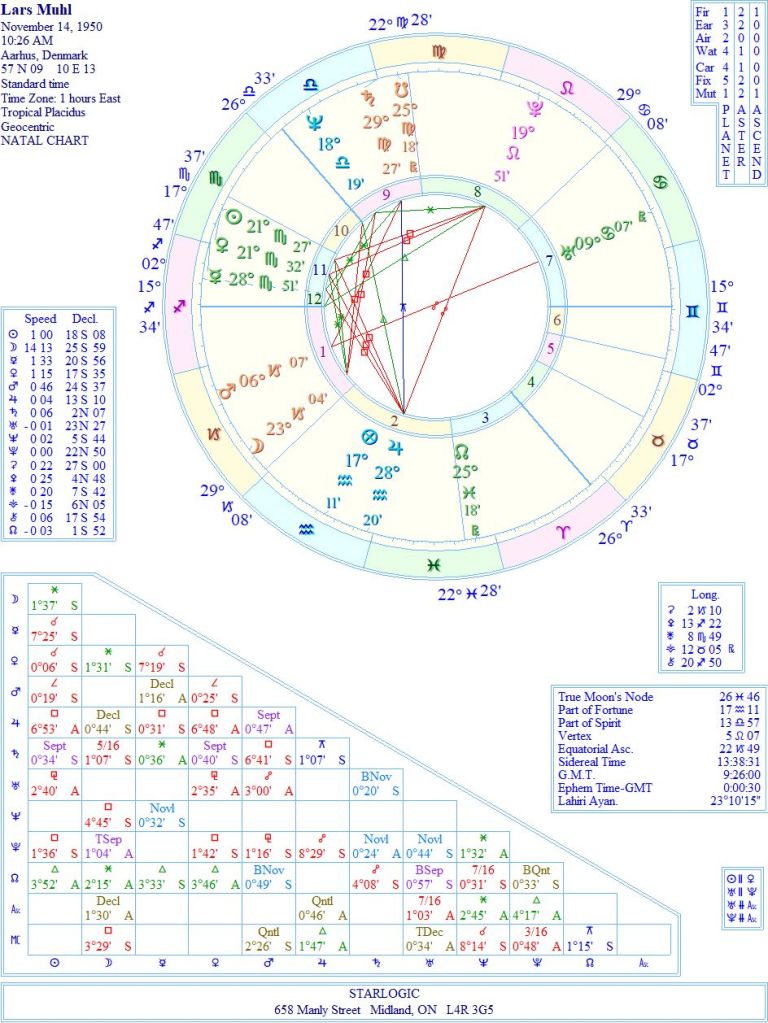 I sent a request to the woman who does the correspondence on Lars’ behalf at larsmuhl.com but she was unable to confirm the timing of his birth, so I have rectified his chart to 2:45 pm, based on the death of his sister when he was 10, and his mysterious illness at age 45. Later, she told me that Lars asked me to change his birth time to 10:26 am. This moves Pluto into his 8th House of death, and the Ascendant to 15 Sagittarius. That puts Lars into alignment with my Ascendant at 19 Sagittarius.