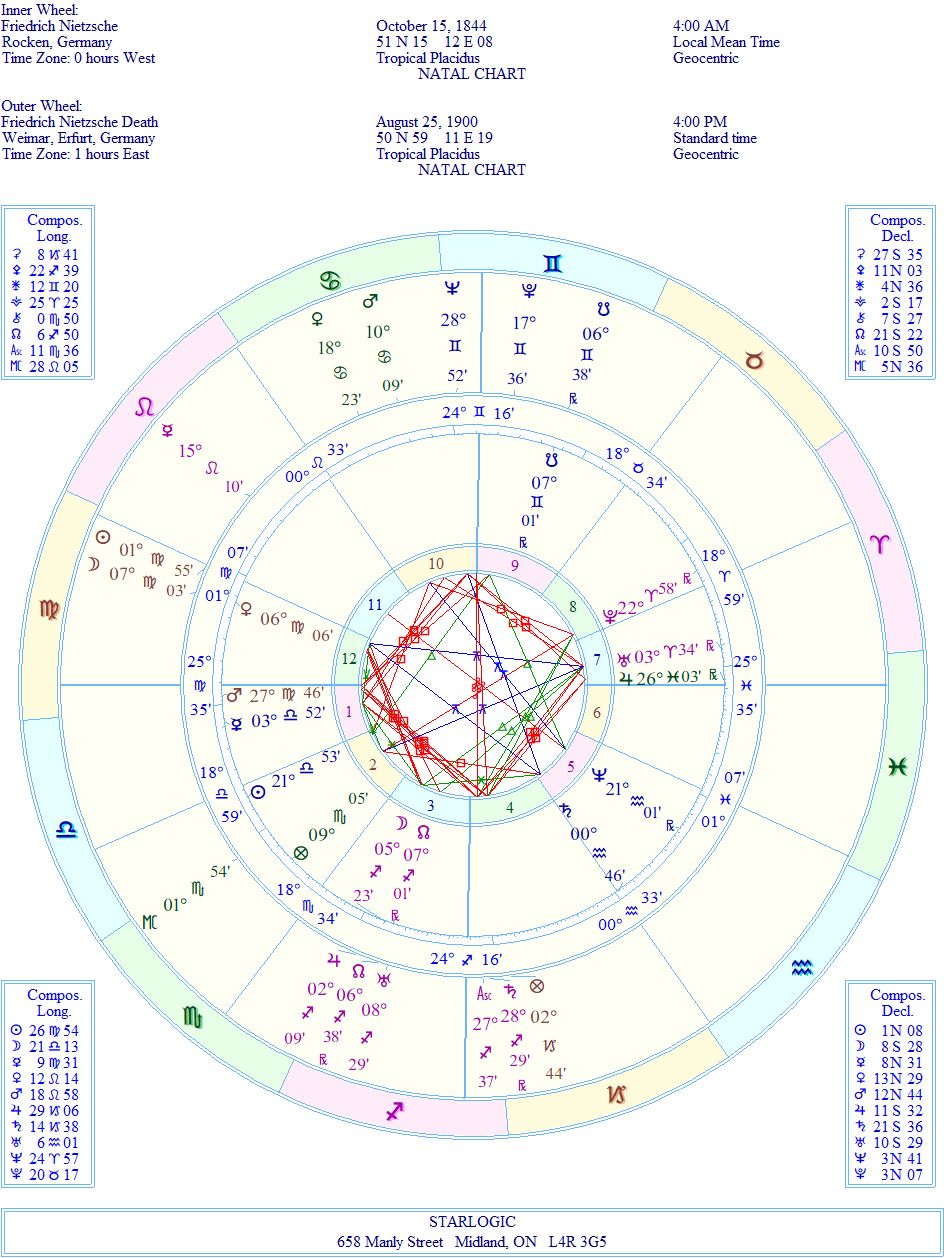 This is a rectified chart, based on two life ‘events’: his success in work at age 24 (Jupiter) and his losing his mind at 44 years old (Pluto). What made him go “mad”? There are two inconjuncts, maybe they can give us a clue, or two.