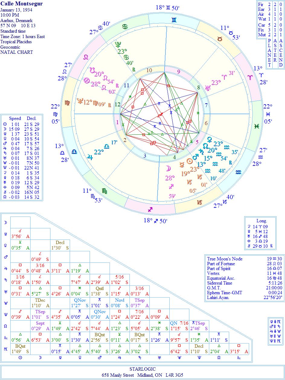 This chart is rectified to highlight the serious accident he had as a child (6 years old), Mars conjunct Saturn in Aquarius. By his own admission, he didn’t want to be in this life, and the bike accident (steel horse) was the echo of his death in a previous life. This time he was born in Aarhus, Denmark, the same place where Lars Muhl was born 16 years later. (Was there something in the water?)