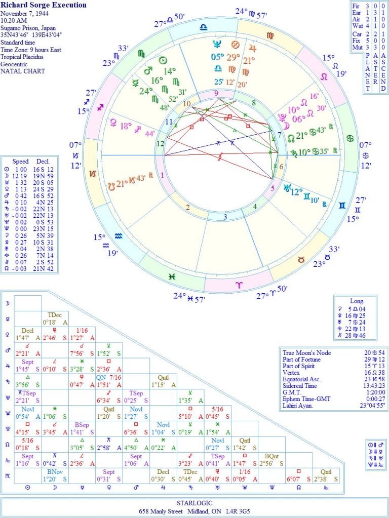 I originally charted the time of Sorge’s birth randomly. And then I saw the detail of his being injured at age 20 years during the Great War. So, I rectified the chart to the placement of Mars at that age. And the result is a double Yod pointing to his Moon/Ascendant conjunction in Aries. That’s his ability to be chameleon-like with his public persona. But note that the inconjuncts are from Venus and Uranus: that’s the ‘oh-oh’ of the chart. Sorge had a reputation as a drunken womanizer. Perhaps the secondary Yod pointing at Uranus from the Moon/Ascendant and Neptune (in Gemini) modified the worst excesses of his cover story as a foreign correspondent and journalist. All I know is that he was caught by the Japanese, tried in court and sentenced to death by hanging. This was carried out 76 years ago today, in history.