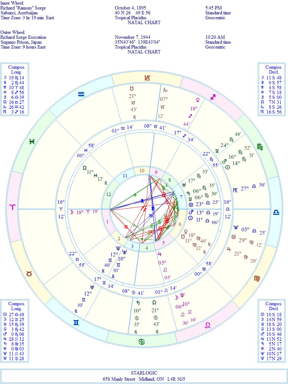 Two inconjuncts carry the native spy energy to Sorge’s last breath: the Moon and the Ascendant; the Sun and Uranus. Now let’s look at these charts combined: