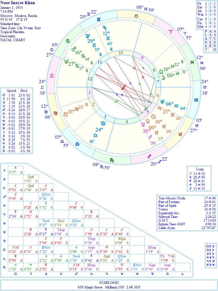 Her ‘death’ time is stated as dawn on the day Noor was executed. When comparing the two charts, a two-handed Yod shows up: ‘fatal’ Uranus inconjunct ‘natal’ Sun inconjunct ‘fatal’ Pluto; and ‘natal’ Sun inconjunct ‘fatal’ Pluto inconjunct ‘natal’ Moon. Her destiny.
