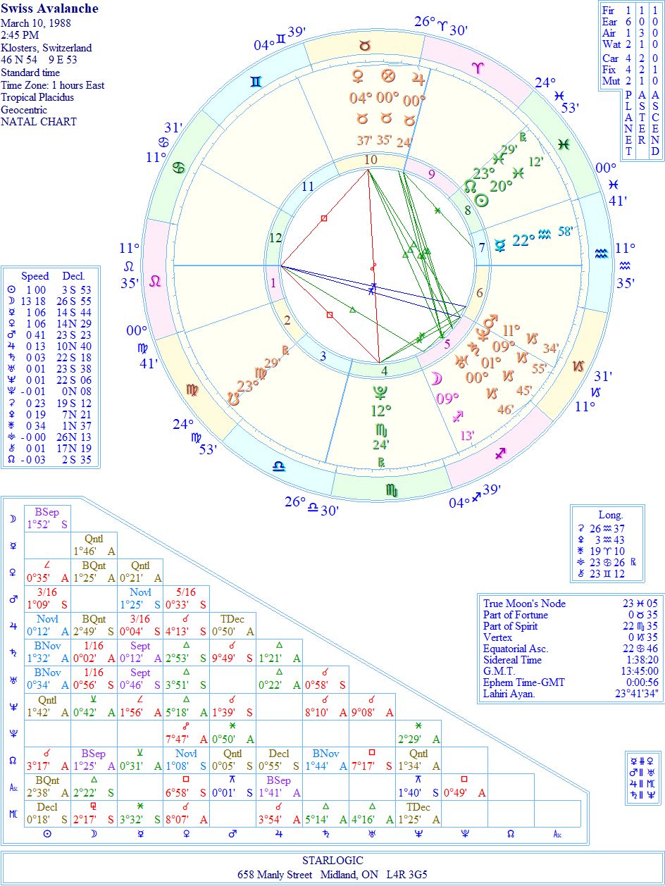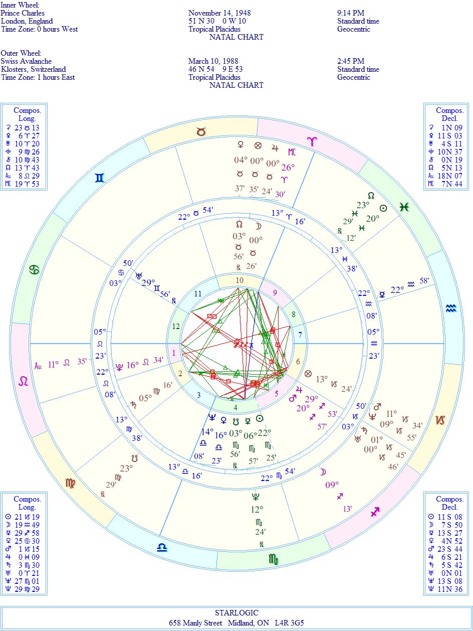 In the ‘event’ chart, Pluto is just beginning to be in opposition to Venus, in a T-square with Leo Rising. You might recall that Charles’ birth chart has Leo Rising, as well. The other link-ups are visible, too. And it is valuable to remember that Pluto is in Charles’ 1st House in his natal chart. It’s the point of his existence: to change the rules. The avalanche’s Pluto is inconjunct to Charles’ Midheaven, his future career.