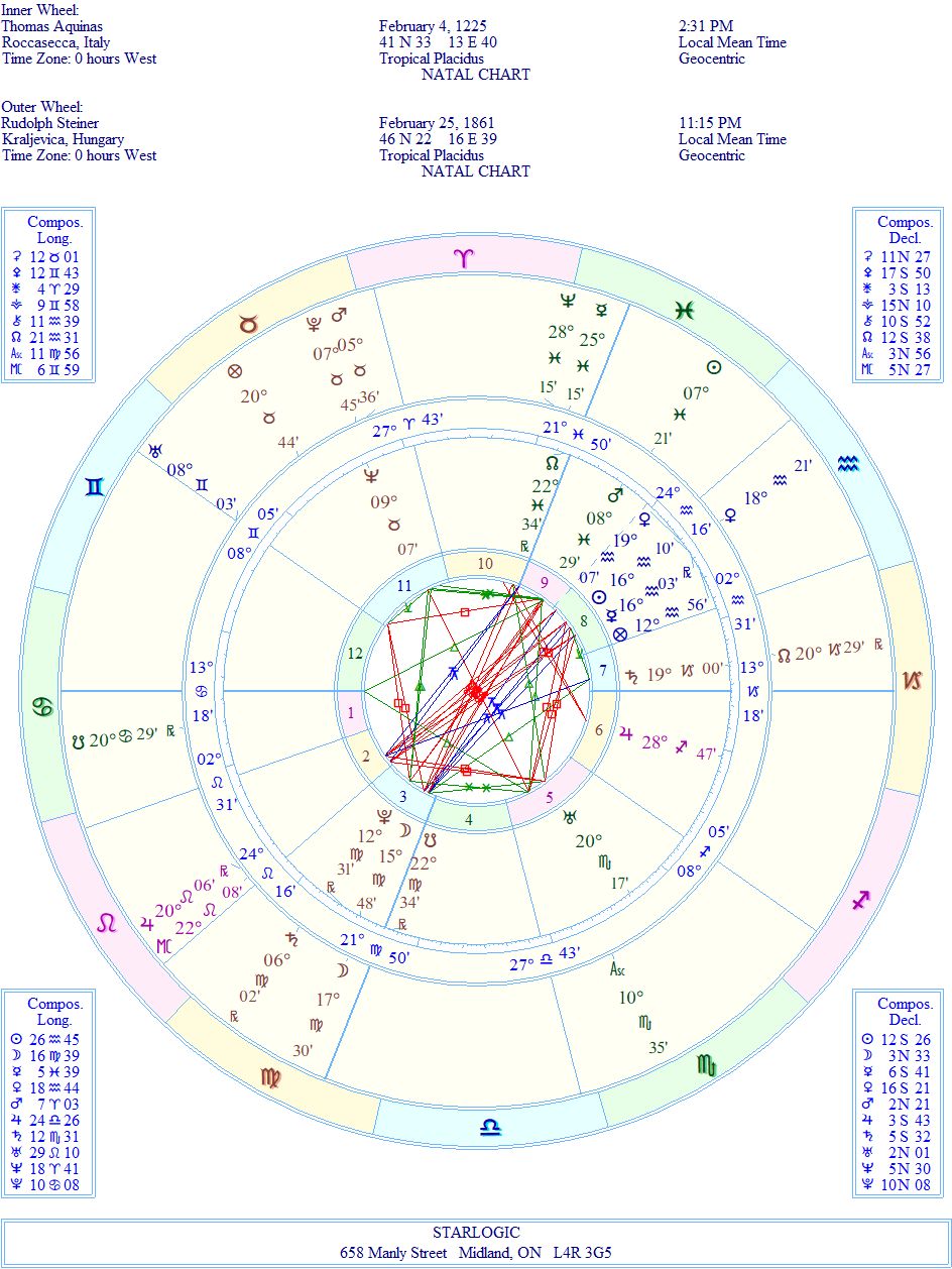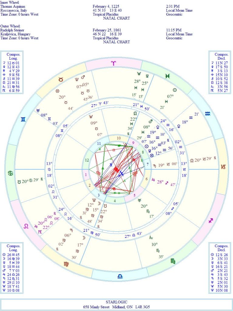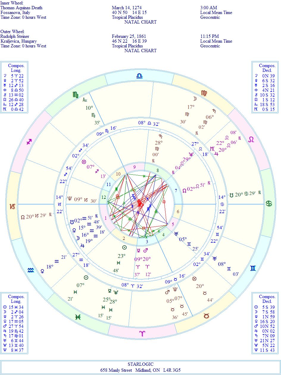 The links between Aquinas’ birth and death charts and Steiner’s birth chart show me that Steiner was indeed the reincarnation of the Saint. And as these things progress, from one life to the next, refinements come in that lead the individual forward to clearer thinking, less restrictions and greater emphasis on the Universality of wisdom.