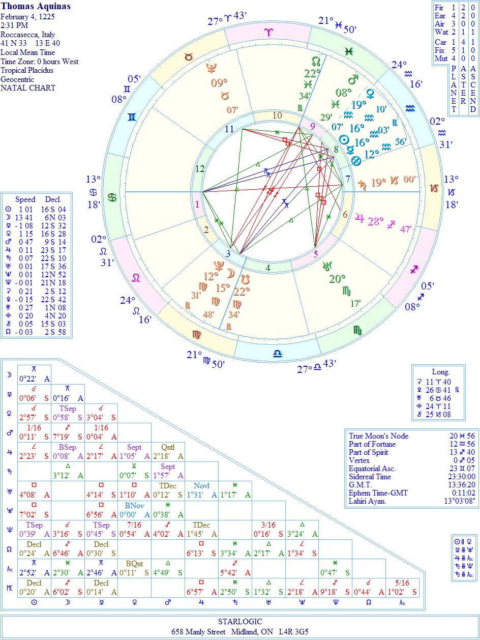 This birth chart is totally speculative, even down to the timing, but if you Google his name, the side panel, purportedly from Wikipedia states his birth date as January 28, 1225. Well, I’m not going to call into question if that’s correct or not, as everyone else says that his birth date is unknown. The timing is based on some events that were a surprise to even his family. The double Yod, linking his Moon and Ascendant with the Sun/Mercury conjunction would indicate (at least to me) that he was destined to be an individual thinker with philosophical tendencies (some say, based on Aristotle).
