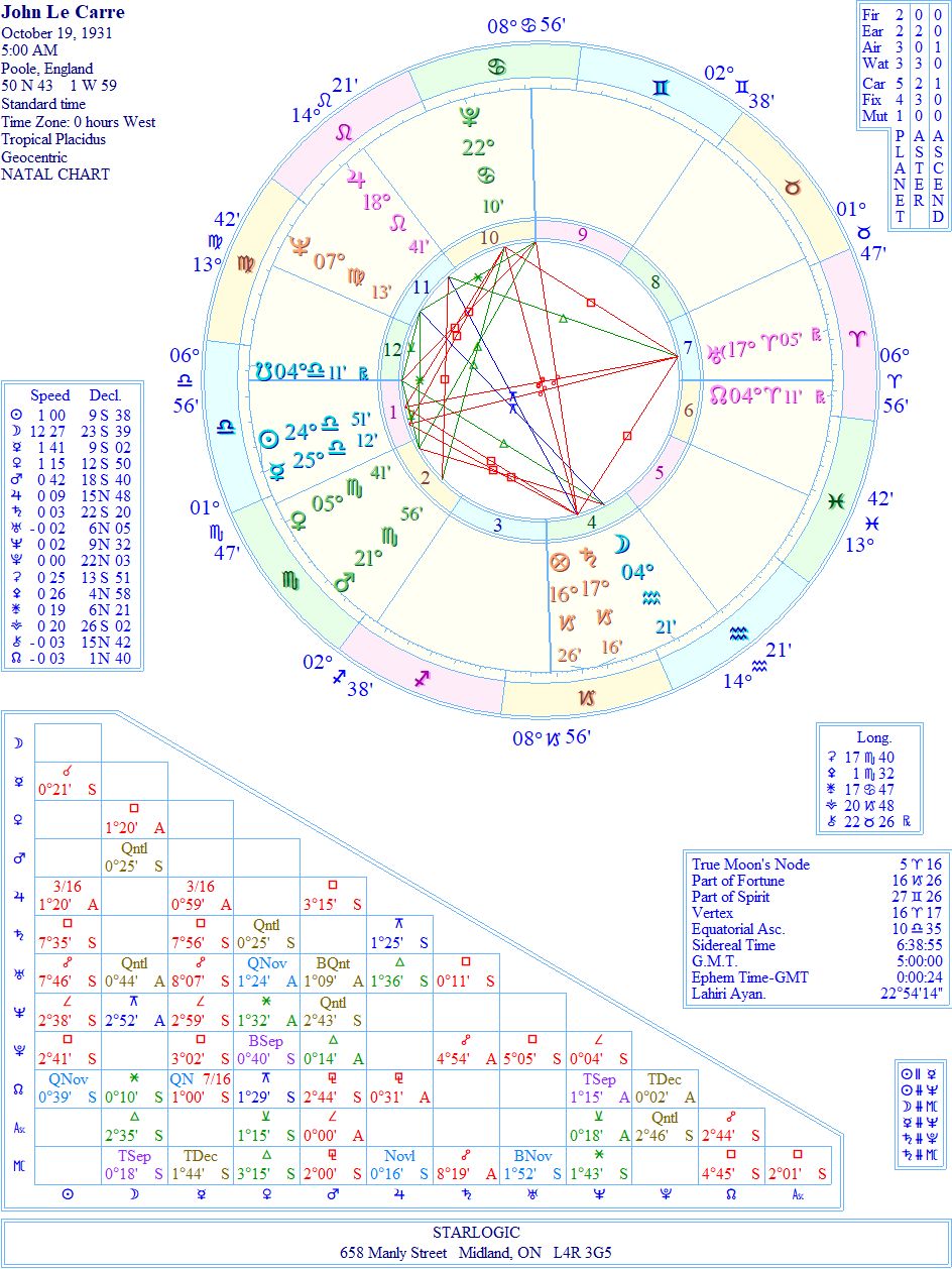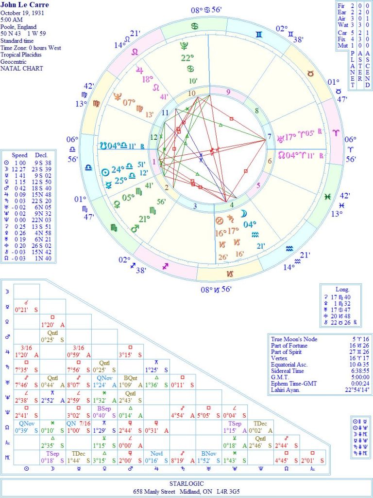 Those details are important in rectifying his birth chart. In David’s case, Saturn (father) and Moon (mother) are in his 4th House (home). His success with “The Spy Who Came In From The Cold” in 1963, when David was 33 years old is signified by Uranus in Aries. It also represents his being outed as a spy (for MI6) by Kim Philby. His cover was blown.