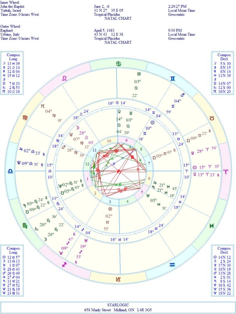 John’s birth time is randomized, but the two charts have some very strong links, especially with the North Nodes and South Nodes being conjunct (along with a conjunction to Raphael’s Saturn), and Raphael’s Sun (in Aries) being opposite John’s Ascendant (in Libra).