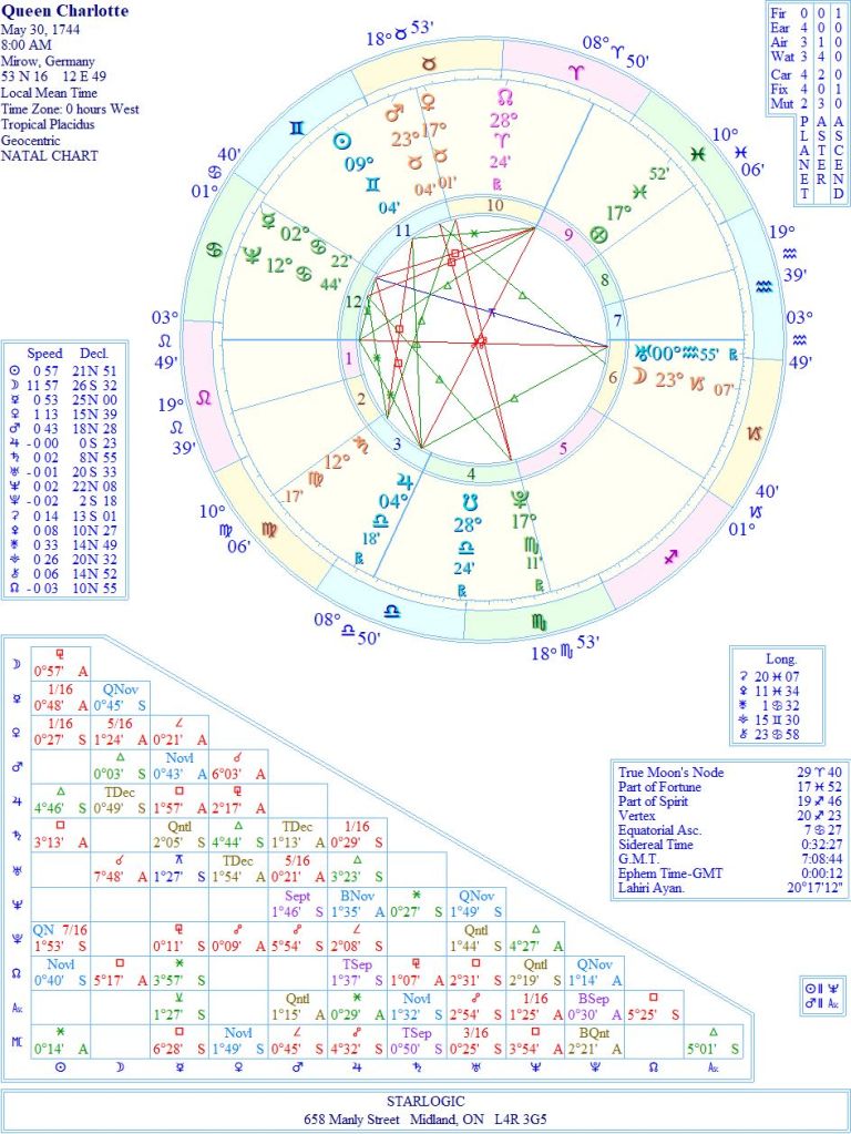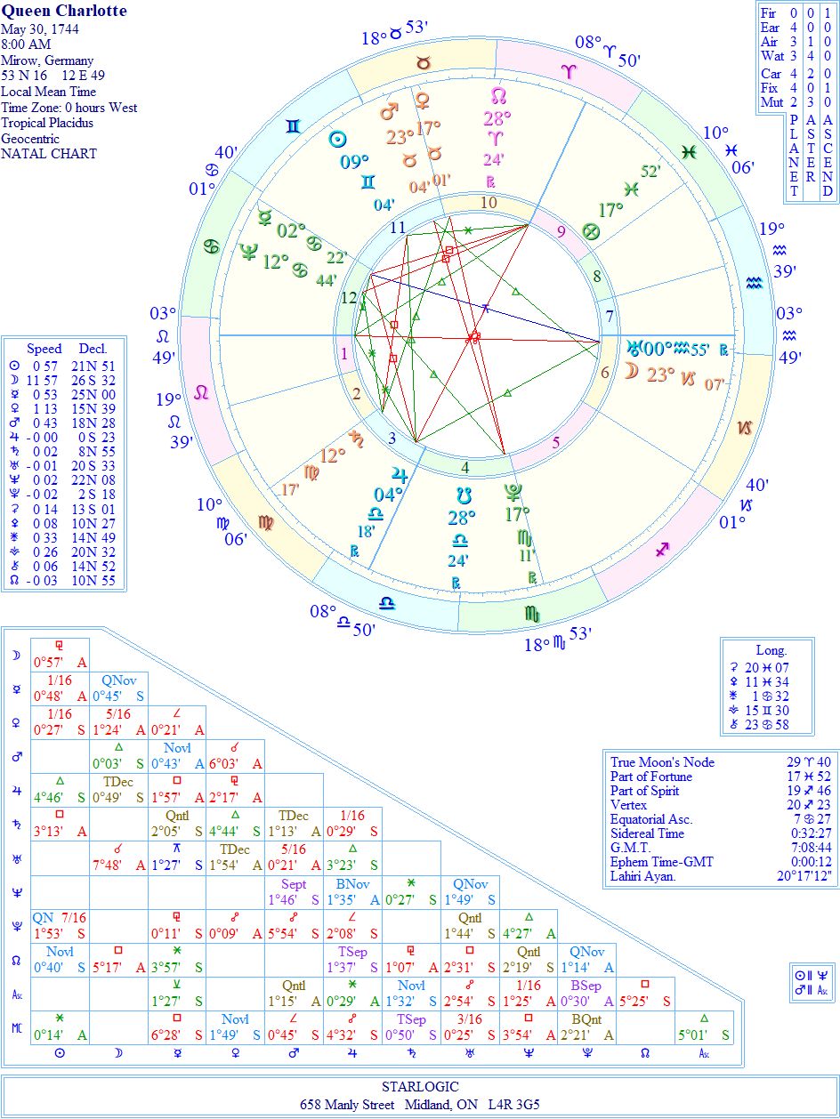This timing is rectified to Charlotte’s marriage to George III and her coronation as Queen (Moon). It is surprising that there aren’t any definitive times, since royalty like to be precise about birth times. There is one inconjunct only, for the day, so let’s look at that.