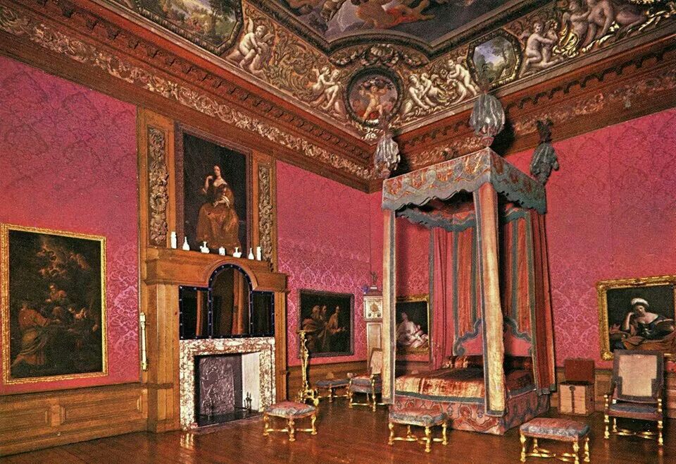 I remember that I was surprised at the size of royal bedroom. It had a high ceiling, and the four-poster bed seemed small, even though the posts reached the ceiling. The curtains and walls, in the present day, were surprisingly pink.
