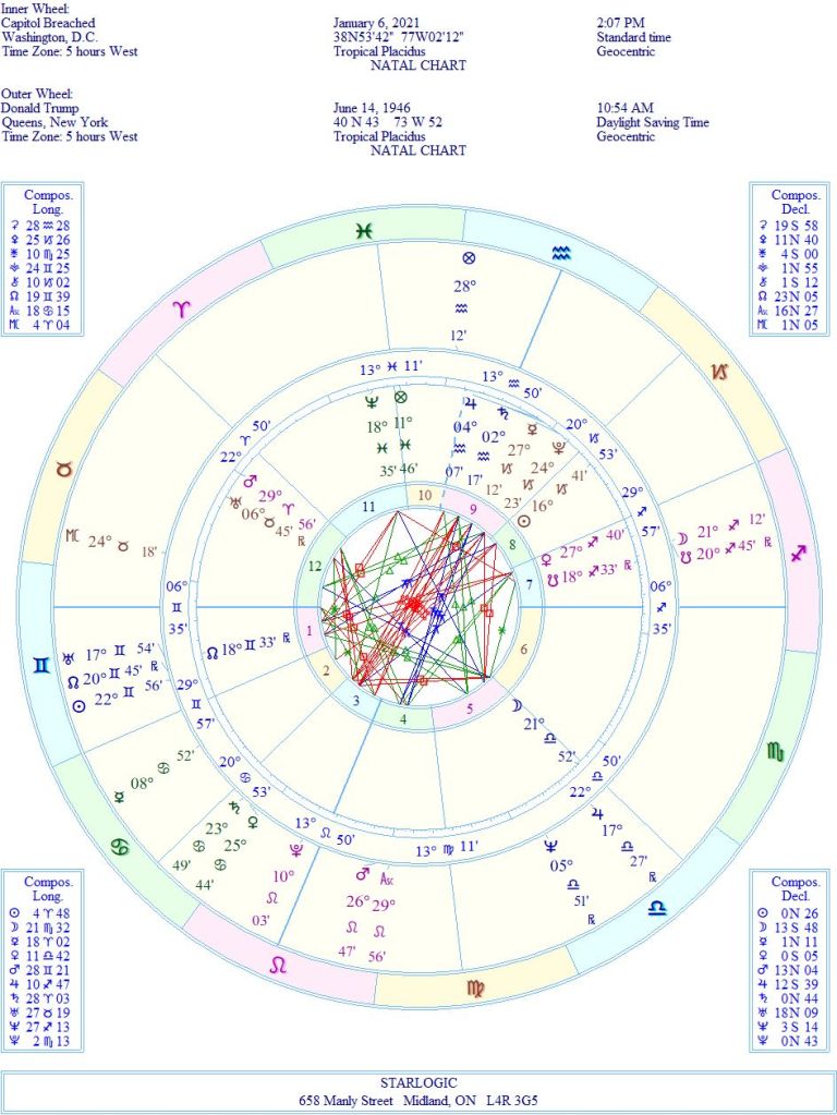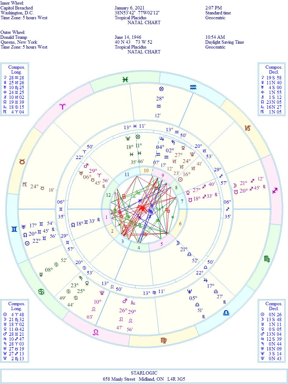 Like the comparison chart combining the Storming of the Bastille and the Capitol Breach of last week, the red aspect lines (of opposition and squares) are everywhere. The President is in the fight of his political life, and Wednesday’s ‘event’ was his last stand. The North Node/South Node axis is evident in both charts, and they are conjunct.