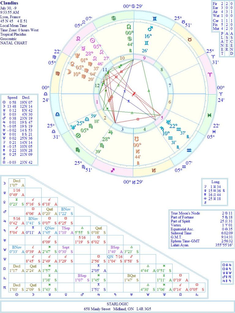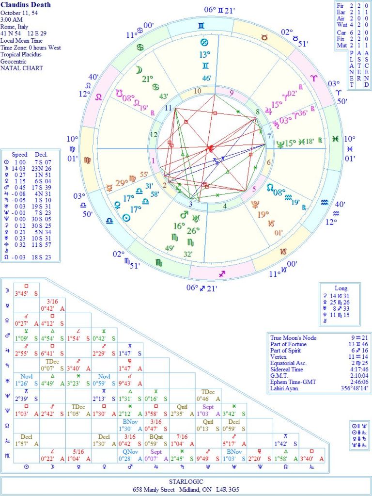 The ‘death’ chart shows an interesting combination of aspects, all pointing to Venus (his ‘wife’). Because Venus is conjunct the Sun, the author(ess) of this event must surely be Agrippina. It looks like I may be needing to look at the women in the Emperors’ lives…