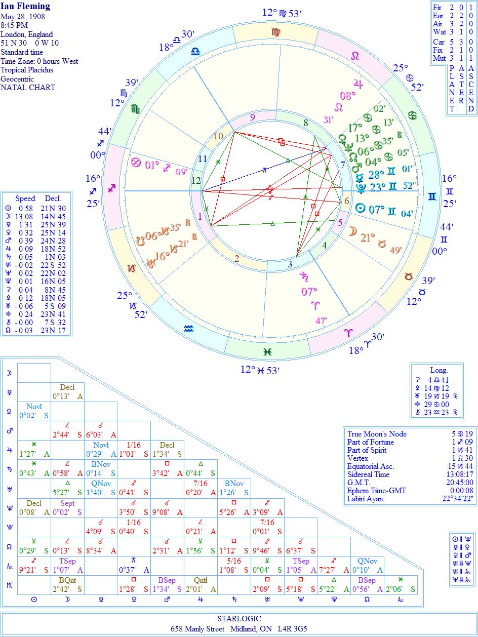 I have rectified this birth chart to recognize the age (9) when Ian’s father (Saturn) was killed in the Great War (1917). By the time, Ian was ready to get his schooling (starting at Eton), his mother (Moon) was in charge of all his decision making. She engineered most of the steps it took to get him into the Admiralty as an adult. She even broke up some of his relationships as being unsuitable: an unmovable force in his life, for sure.