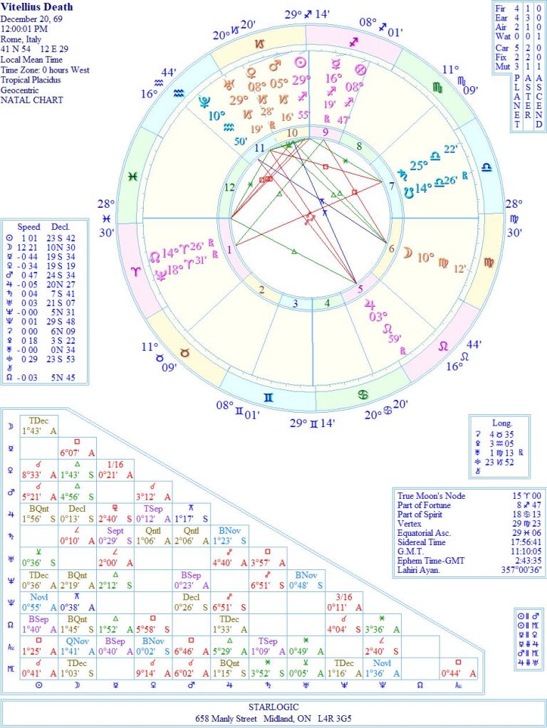 Again, I do not have an exact time of death, so I set the clock for 12:00 noon. His being dragged to the Gemonian stairs where the people killed him and threw his body into the Tiber River (with or without his head) is that Moon Inconjunct Pluto aspect in the ‘death’ chart. And his last words were recorded as: “Yet I was once your Emperor”.