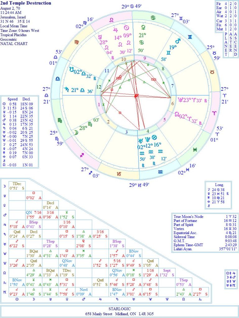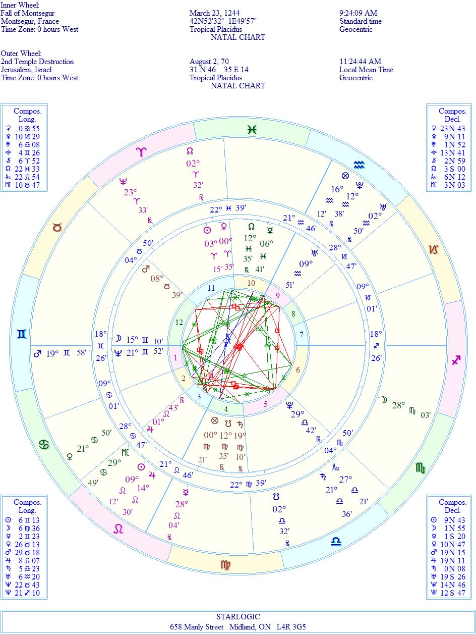 As both these charts are randomized, I shouldn’t have seen such a clear link between Moon/Neptune/Ascendant conjunction in the Montsegur chart and the Jerusalem Mars. (But there it is!) And the Jerusalem Ascendant in Libra is conjunct Montsegur’s Pluto.