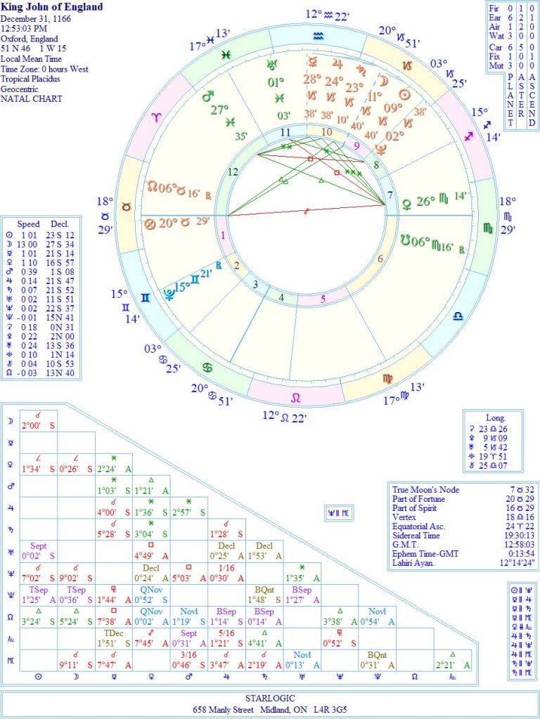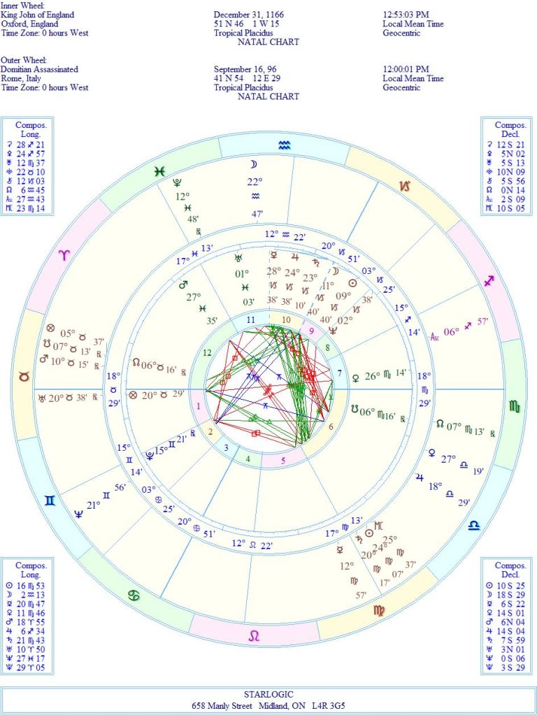 Comparing their birth charts may help to clear this up: Domitian’s Ascendant is conjunct John’s Venus; Domitian’s Pluto is conjunct John’s Sun/Moon aspect; John’s Ascendant is opposite Domitian’s Mercury/Venus conjunction. Make no mistake: the Roman Emperor took away the Senate’s powers in all but name, and John gave the Barons rights that became the basis for the British constitution (if you can call it that).