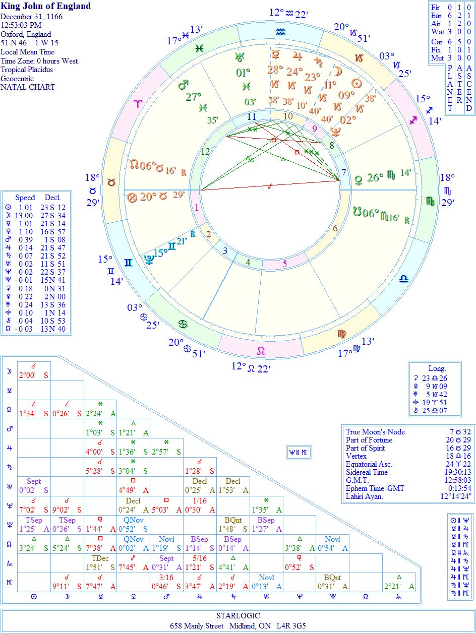 The timing of this chart is randomized. Notice that there are no inconjuncts. But there is a strong Sun/Moon conjunction in Capricorn, so, even though he was the youngest of four surviving sons of Henry II, he was also the obvious heir to the throne of England.