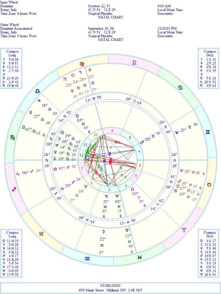 This chart is rectified to show Domitian‘s assassination at age 44 (Mars). That stellium of planets in Scorpio, along with the Ascendant is indicative to his use of stealth to attain his gains. And Neptune in opposition to the Midheaven says the same thing. He cheats…