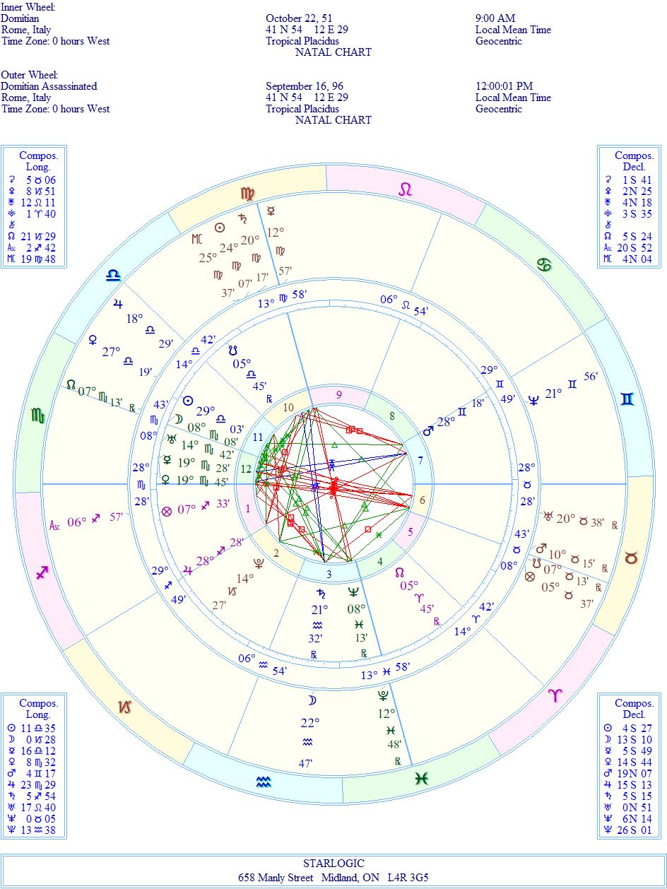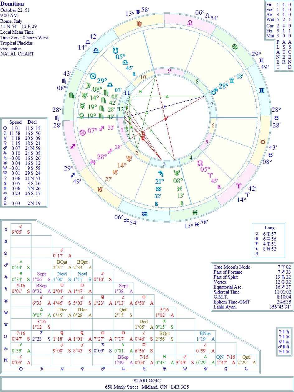 This chart is rectified to show Domitian‘s assassination at age 44 (Mars). That stellium of planets in Scorpio, along with the Ascendant is indicative to his use of stealth to attain his gains. And Neptune in opposition to the Midheaven says the same thing. He cheats…