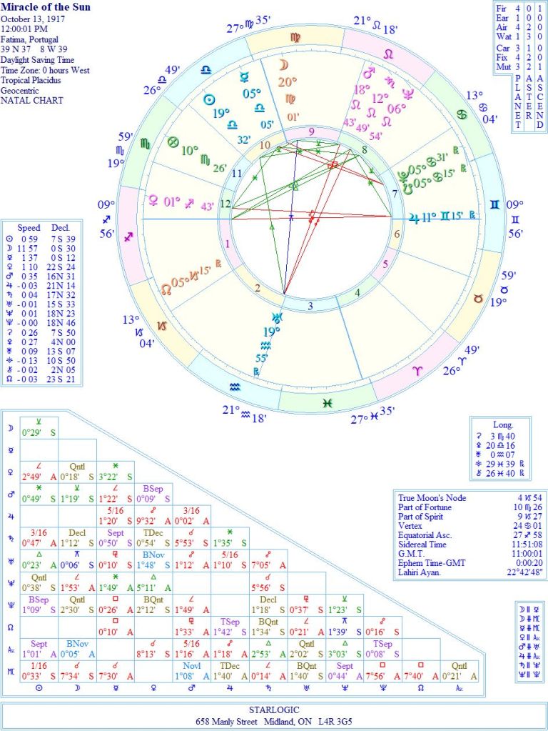 Although not explicitly stated in the 2020 film Fatima, the monthly meeting of the three children with “The Lady of the Rosary” seemed to take place at lunchtime. So I have chosen 12:00 noon for this chart.