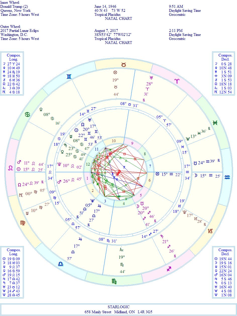 I wanted to get a good image of this lunar eclipse, so I did a Google search. Note the date. This seems to be contradictory, until you realize the photos were taken in Malaysia. Such is the effect of global time zones. Why I’m looking at this partial eclipse now is that the writer of the Donald Trump Birth Time Mystery suggested that the focus would be better spent on this event, rather than the total solar eclipse, two weeks later. Now that I’ve looked at it, I would definitely agree.