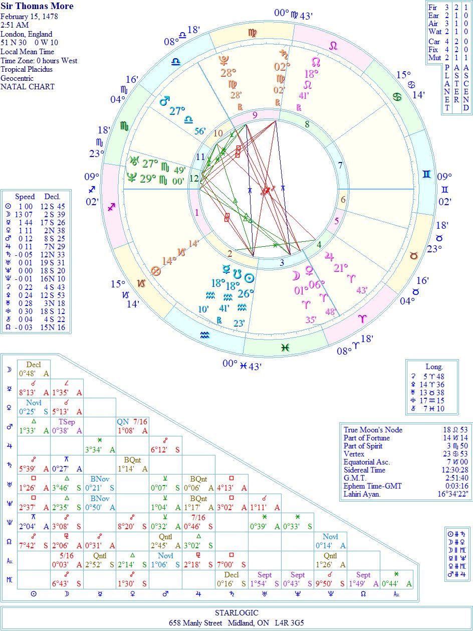 Most astrology sites give his birth time as 2:30 am, mainly because his father noted the time as ‘between 2 and 3 in the morning’. One person suggested 2:51 am, so I’m going with that time. Nine degrees Sagittarius as the Ascendant seems a very reasonable result. Besides Uranus/Neptune conjunct in Scorpio in his 12th House gives a flavour that would otherwise be missing. There are two inconjuncts.