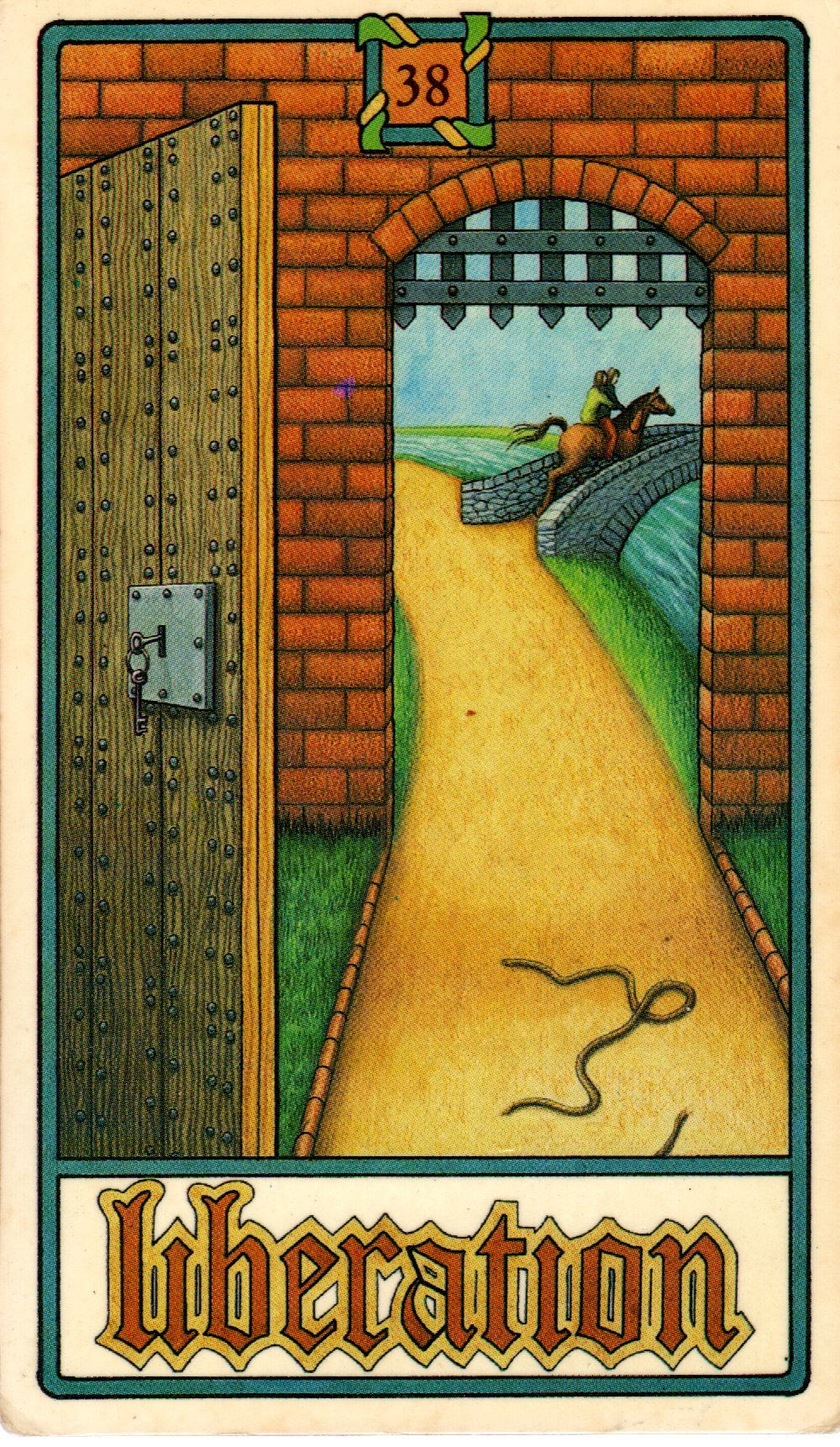 Here is depicted the joyous escape from a constricting situation. It stands for those situations where, often by some outside agency, we are somehow set free to make a new life. However, note that although the key is in the lock, there is no bolt, therefore the card also represents those situations where we do have the ability for release from within ourselves.