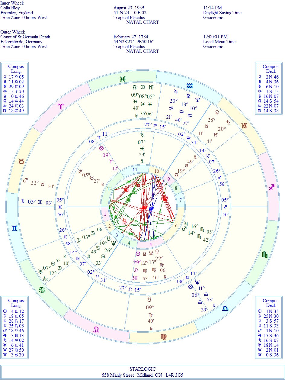 Oh-ho! There you go: Colin’s Saturn is conjunct the Count’s ‘fatal’ Sun/North Node/Midheaven in Pisces; the Count’s Moon is conjunct Colin’s Ascendant in Gemini; Colin’s Moon is conjunct the Count’s ‘fatal’ Uranus; and Colin’s North Node is conjunct the Count’s ‘fatal’ Saturn. One final link: the Count’s ‘fatal’ South Node is conjunct Colin’s Mercury/Neptune conjunction in Virgo. Reincarnation, for sure.