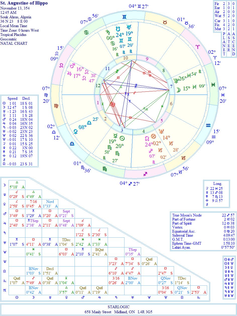 This chart is rectified to show his conversion (Pluto) to Christianity at the age of 32. There are four inconjuncts.